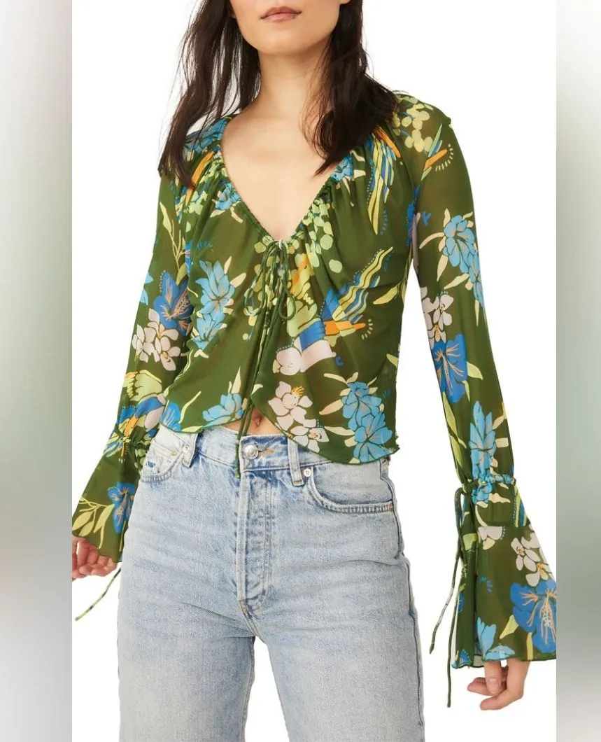 Bell sleeves add a dramatic touch to this sheer blouse with an adjustable shirred neckline and sligh... Show more