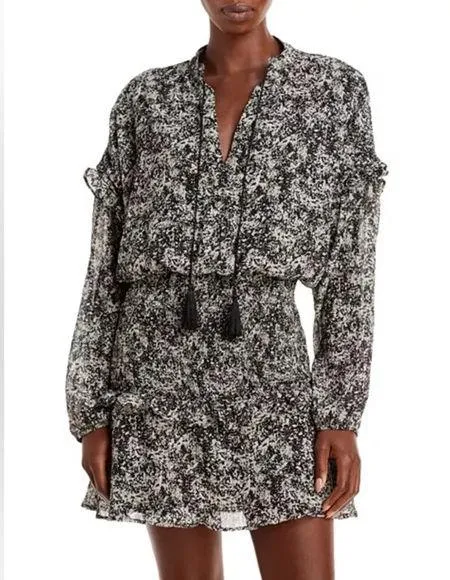 V-neck with banded collar and tassel ties Long blouson sleeves with ruffle trim, elasticized cuffs W... Show more