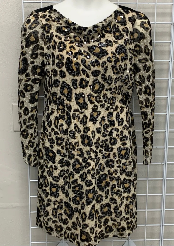 leopard print with sequin accents, long sheer sleeves with slit cuffs, a scoop neckline, and is knee... Show more
