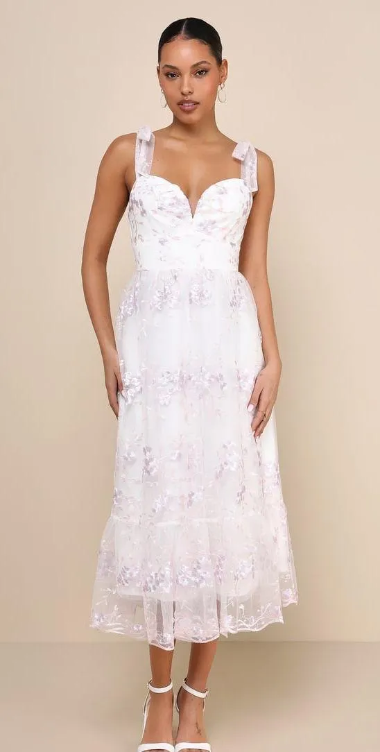 Lightweight mesh fabric, with floral embroidery (in hues of pink and purple) throughout, shapes tyin... Show more