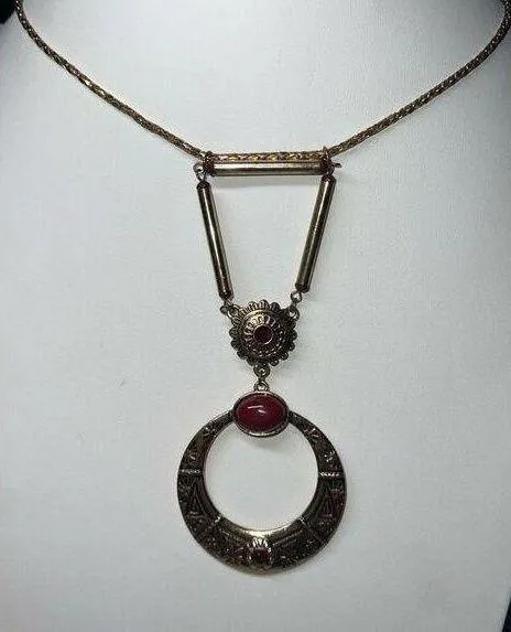 Boho Ethnic Burnished Gold Tone and Red Stone Pendant Necklace - $17 - From A Little
