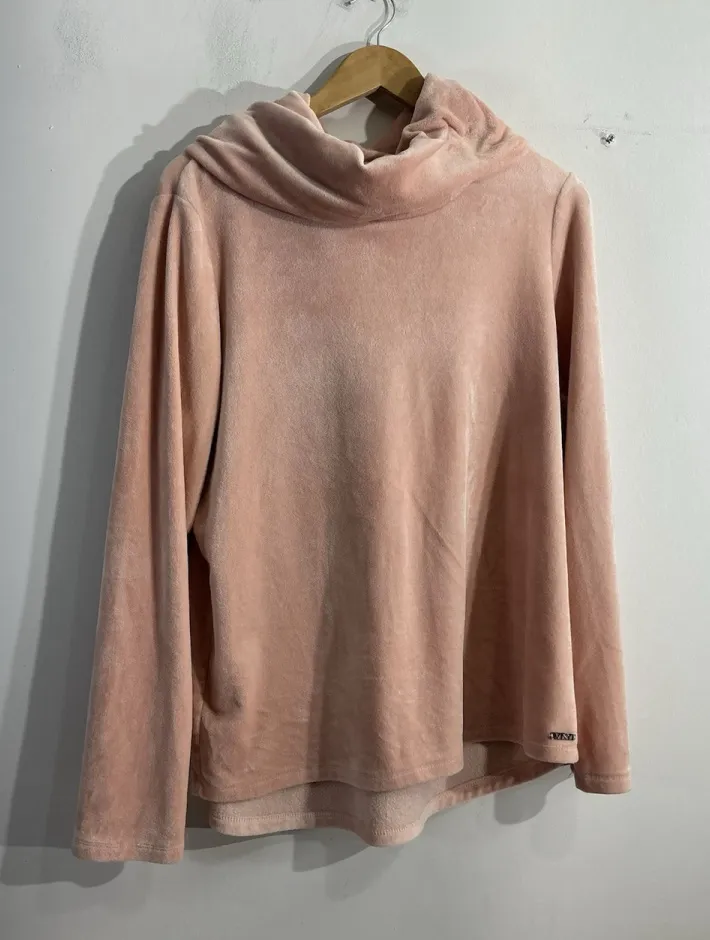 This is a Marc NY performance pull-over velour sweater for women in XL size. It features a cowl neck and long sleeves, with a mauve color that falls under the pink category. The style is a pullover, making it easy to wear and perfect for cooler weather. Made for comfort and style, this sweater is a versatile addition to any woman's wardrobe. These is pre owned and looks to be in excellent condition!