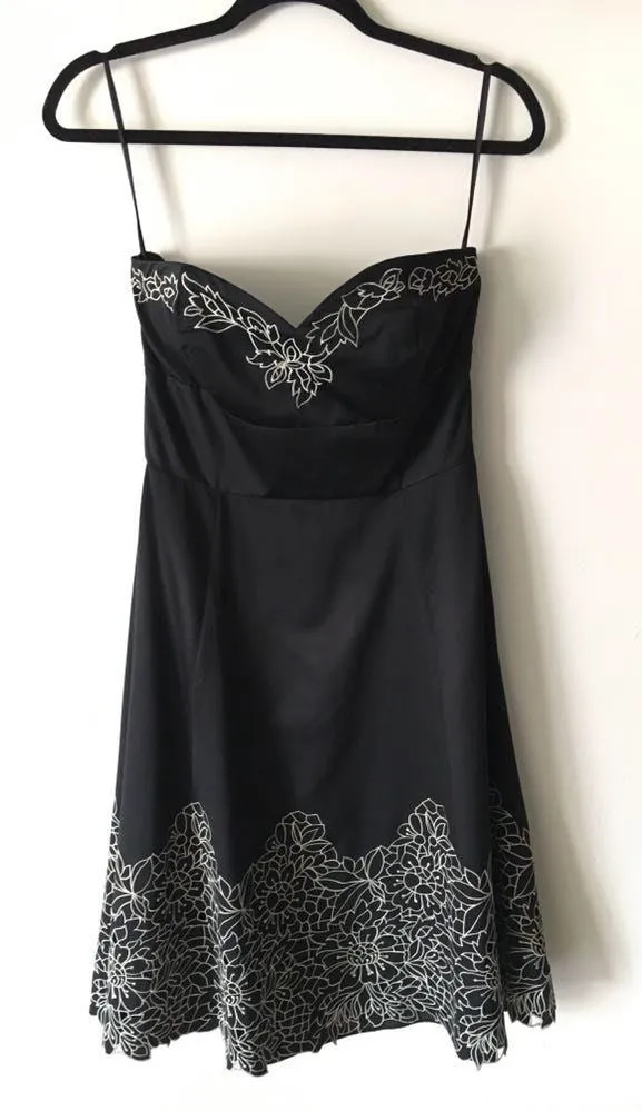 Black strapless dress with floral hem design. 33” Shoulder to hem. 14” armpit to armpit. Side zipper... Show more