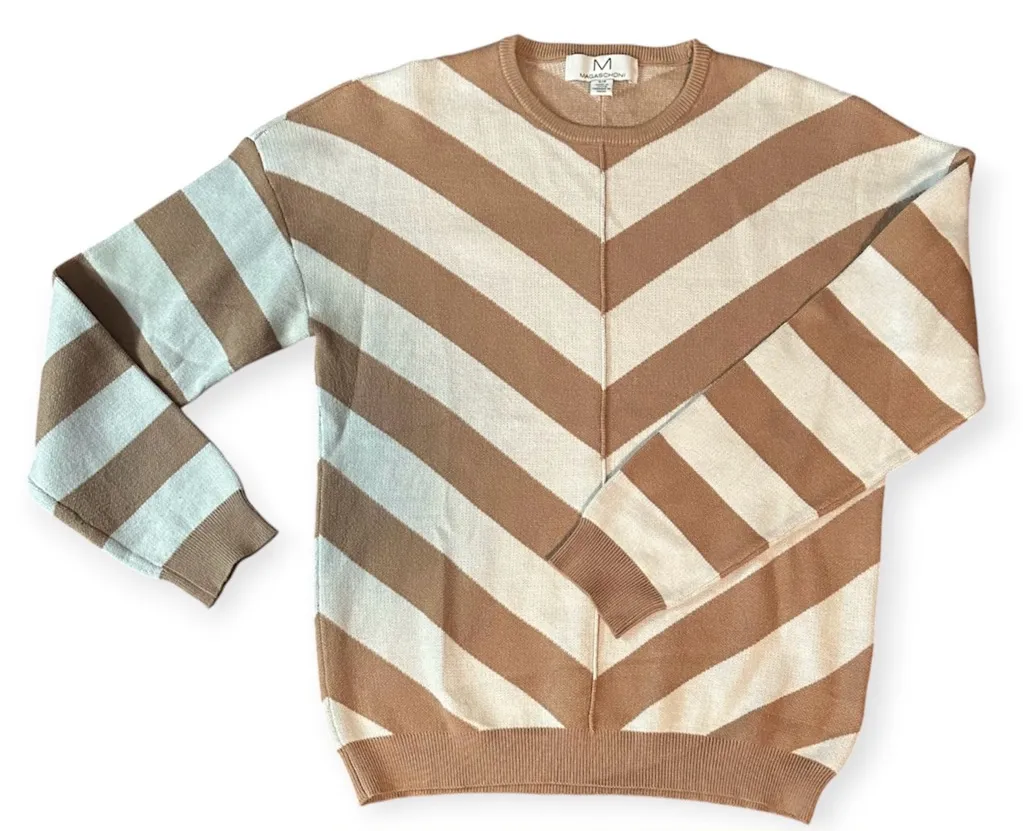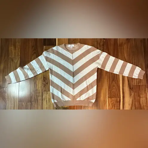 Long Sleeves 52% Viscose/28% Polyester/20% Nylon Hand Wash only Preloved Elevate your look with this stylish chevron sweater. Features tan and cream stripes. Ideal for casual wear.