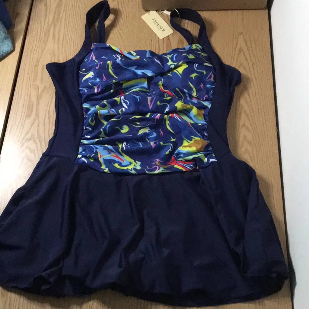 B44 New Women’s Ekouaer Swim Dress Ruched Front Color Navy lime pink blue white etc Size XXLarge Ruched tummy to hide your tummy Stylish and comfortable swim dress in navy is perfect for fun in the water. Featuring a vibrant, colorful pattern, it combines fashion and function for your swimwear collection