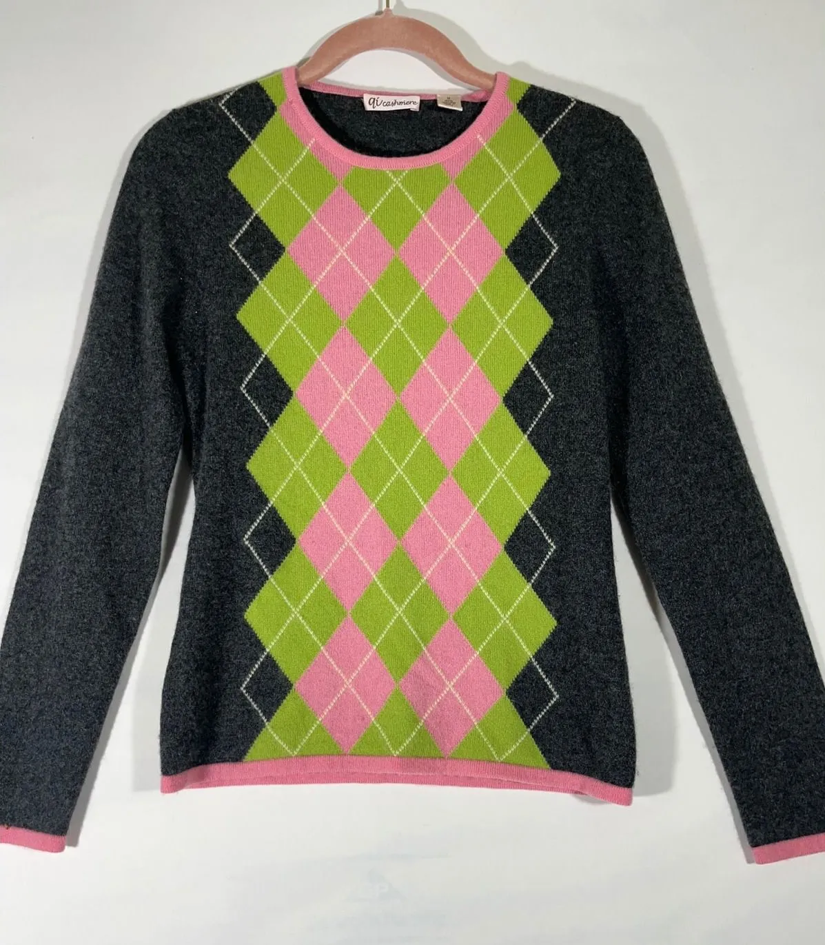 Embrace classic preppy style with this charming Qi Cashmere sweater. The iconic argyle pattern in vibrant pink and lime green pops against the sophisticated charcoal gray base, creating a look that's both playful and polished. Ribbed pink trim at the neckline, cuffs, and hem adds a refined touch, while the luxurious 100% cashmere offers unparalleled softness and warmth. Perfect for a casual day out, a relaxed weekend brunch, or adding a touch of timeless flair to your office attire. Measurements: • Chest (pit to pit): 18 in • Length (shoulder to hem): 23 in • Sleeve Length (shoulder to cuff): 23 in Style: Pullover Department: Women Material: 100% Cashmere Neckline: Crew Neck Theme: Retro, Argyle Sleeve Length: Long Sleeve Type: Sweater Features: Stretch Pattern: Argyle/Diamond Sleeve Type: Long Sleeve Fabric Type: Knit Knit Style: Tight-Knit Season: Fall, Spring, Winter Fit: Classic Occasion: Casual, Workwear Keywords: cashmere sweater, argyle pattern, preppy style, pink and green, crew neck, long sleeve, women's medium, designer knitwear, classic design, cozy, sophisticated, fall fashion, winter wear, talented knitwear Thank you so much for your purchase! Shipping Days Monday Wednesday Friday!