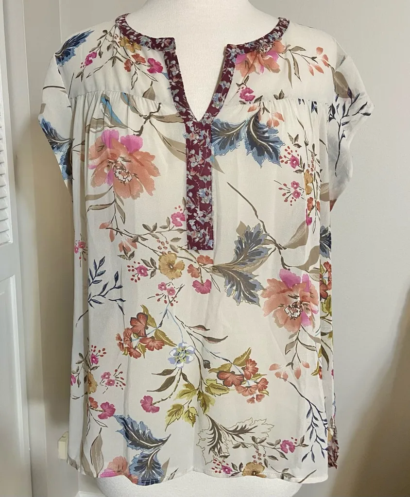 DR2 by Daniel Rainn mixed print floral cap sleeve top Sheer with floral blossom print on cream and petite flowers on maroon Notched neckline and keyhole detail back Flowy oversized fit Material Content: 100% Polyester Very little stretch Condition is as pictured; very good gently preloved condition. No noted flaws or callouts. # whimsy countryside prairie business casual corporate office Fairy boho autumn