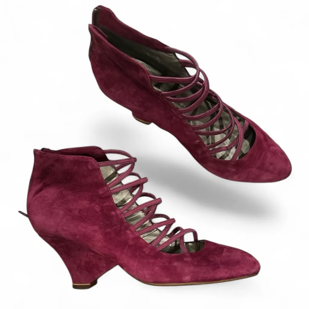 JEFFREY CAMPBELL PURPLE WEDGE POINTED TOE ELASTIC CAGE SUEDE SHOES Zips at the back of the heel. S... Show more