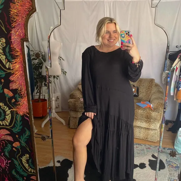 FP Beach Maxi Dress Small Black Pullover Round neck Long sleeve Side slit Loose fit
