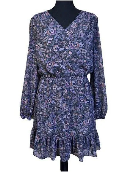 V-neck Small elastic waistband Elastic cuff sleeves Fully lined dress Balloon style sleeves Excellent, preowned condition No flaws, stains or holes. Measure Chest 18 1/2 inches across Waist 14 inches at rest but stretches another 3 inches Hips 21 inches across Length 36 inches Sleeves 24 inches