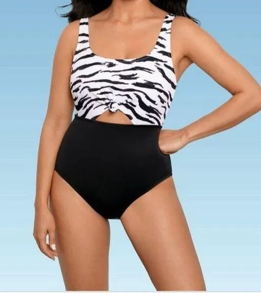 Beach Betty by Miracle Brands Slimming Control Tie-Front Cut Out One Piece Swimsuit. Size M. New with tags. Soak up the sun this summer with Beach Betty's Slimming Control Knot Front One Piece. The modern silhouette gives a look that's sleek and flattering, with an extra touch of style. The knotted front is adjustable, with a cute peekaboo cut-out to show a little skin. Miracle Brands exclusive fabric smooths your shape, while removable foam cups keep you comfortably supported all day long. Color: Black/White Pattern: Wave. Material: Shell-62% Nylon, 38% Lycra Spandex Lining-100% Polyester Smoke free/pet free home. DD3