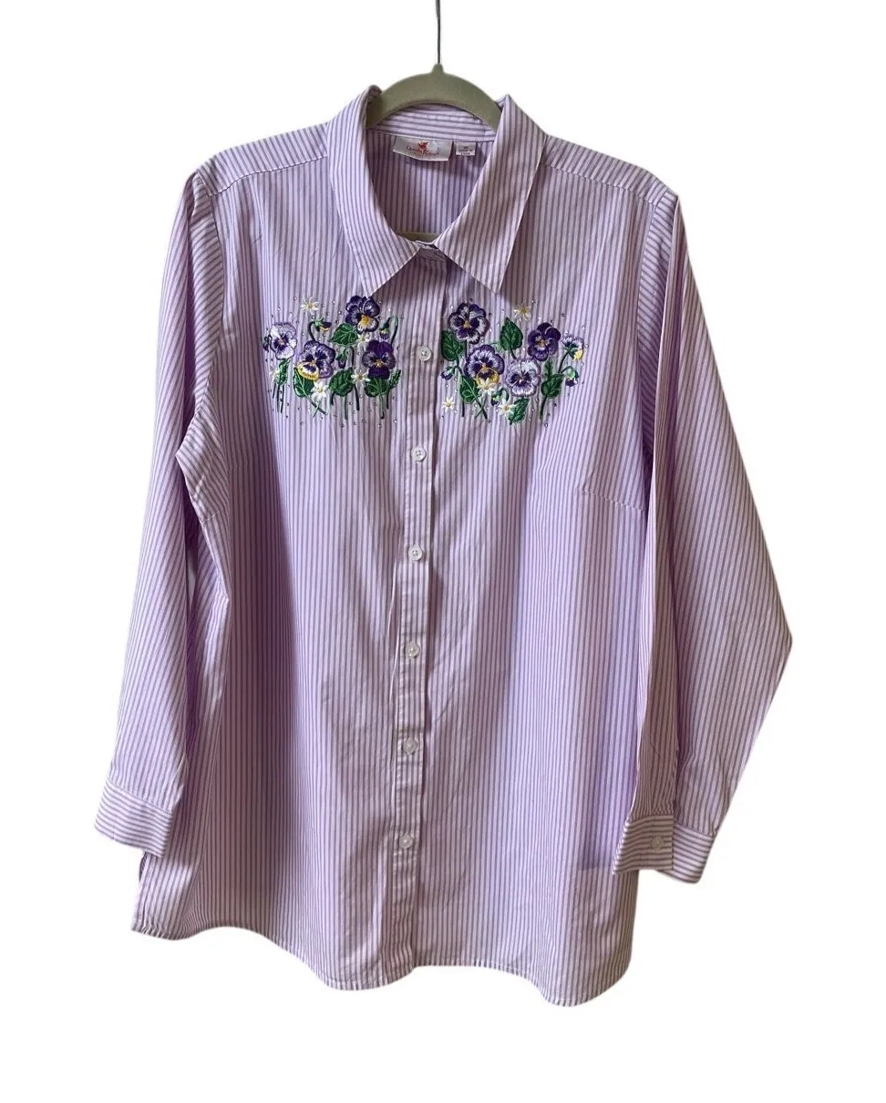 Quacker Factory striped blouse with embroidered pansy pattern Sz XL Purple and white stripe Sone sp... Show more