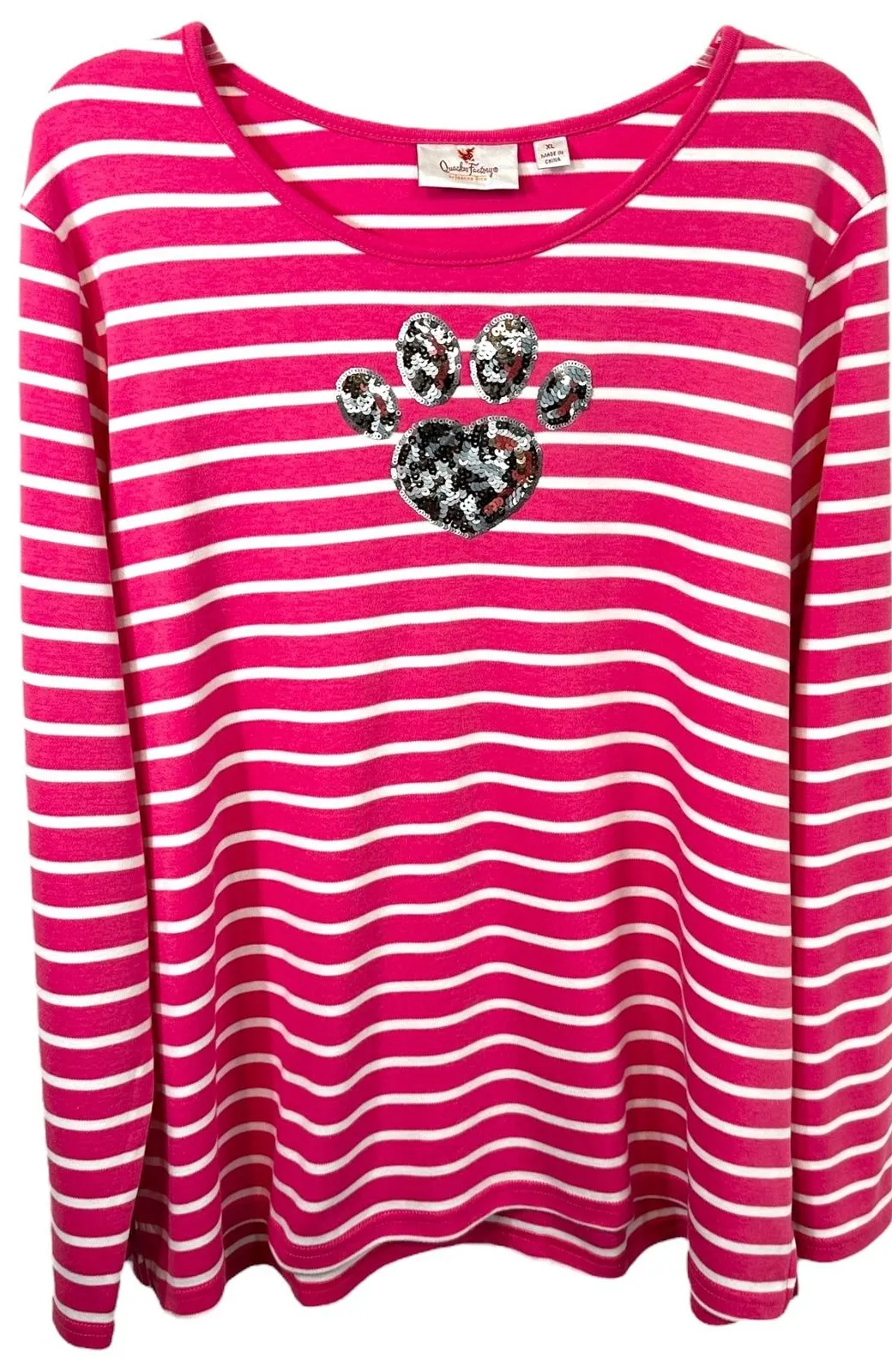 A stylish Quackey Factory long sleeve top in a vibrant pink and white stripe pattern. This shirt features a charming sequined paw print with a heart accent on the front, adding a touch of sparkle. The classic crew neckline and comfortable long sleeves make it a versatile addition to any casual wardrobe. Chest: 26" across Length: 28" Type: T-Shirt Department: Women Style: Basic Material: Cotton, Polyester, Cotton Blend Neckline: Crew Neck Sleeve Length: Long Sleeve Sleeve Type: Classic/Fitted Sleeve Pattern: Striped Accents: Sequin Theme: Dog Features: Stretch Fit: Regular Keywords: Quackey Factory, Jeanne Rice, pink striped shirt, long sleeve top, paw print shirt, heart sequin, sequin top, women's t-shirt, casual top, striped tee, dog lover gift, pet themed, XL shirt, comfortable shirt, sparkle top Very good, pre-owned condition! Smoke-free, pet-free. Ships within 1 to 2 business days. Save the planet. Shop second-hand.
