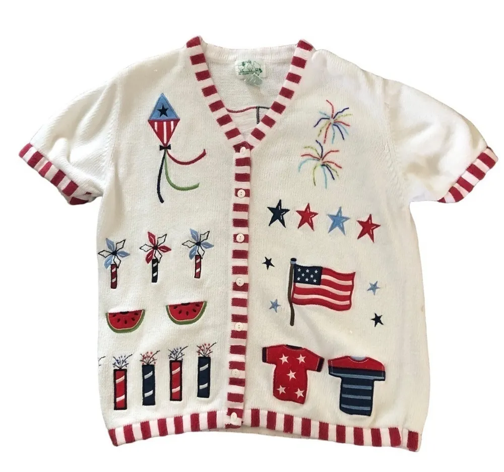 Red White & Blue Ya”All! V~Neck Short Sleeve Cotton Rayon Blend Button front Beaded/Sequined/Embroidered Solid back W/ American Flag Perfect Patriotic Summer Sweater Free of stains/holes Some light wear from laundering Bust: 44” some stretch Length: 26” From a smoke free home Costal Grandma Grandmacore Patriotic Red white & Blue Summer 4th of July Americana