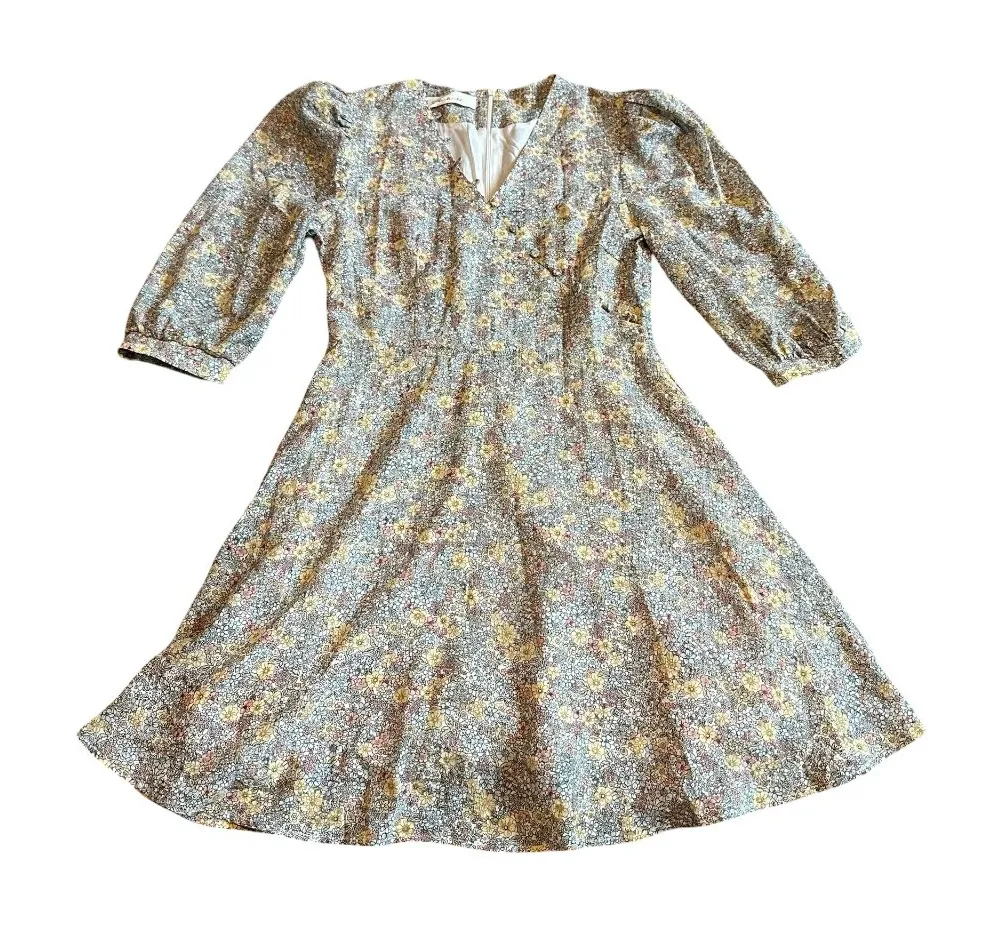 Quanta du Soleil Size 36 EU / Size small women's US White dress with pretty pastel floral print Puff sleeves at 3/4 length; Asymmetrical button detail at neck Hidden zip; Fully lined; defined waist Wedding guest bohemian cottagecore international quiet luxury floral print colorful silk lining feminine girly everyday casual Shell: 95% nylon/5% rayon / Lining: 100% silk wadding Measurements taken across the front when laying flat: Bust: 17", Waist: 15", Length: 35", Sleeve length from neck: 21" In excellent condition; no stains, holes or flaws