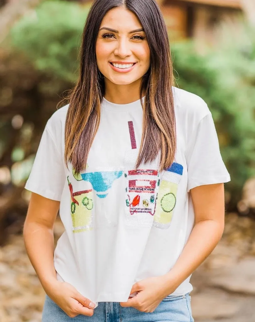 Size XL There is some discoloration on the front below the sequin design. It’s a faint blue color transfer. May come off with spot treatment. Margarita sequin design on the front