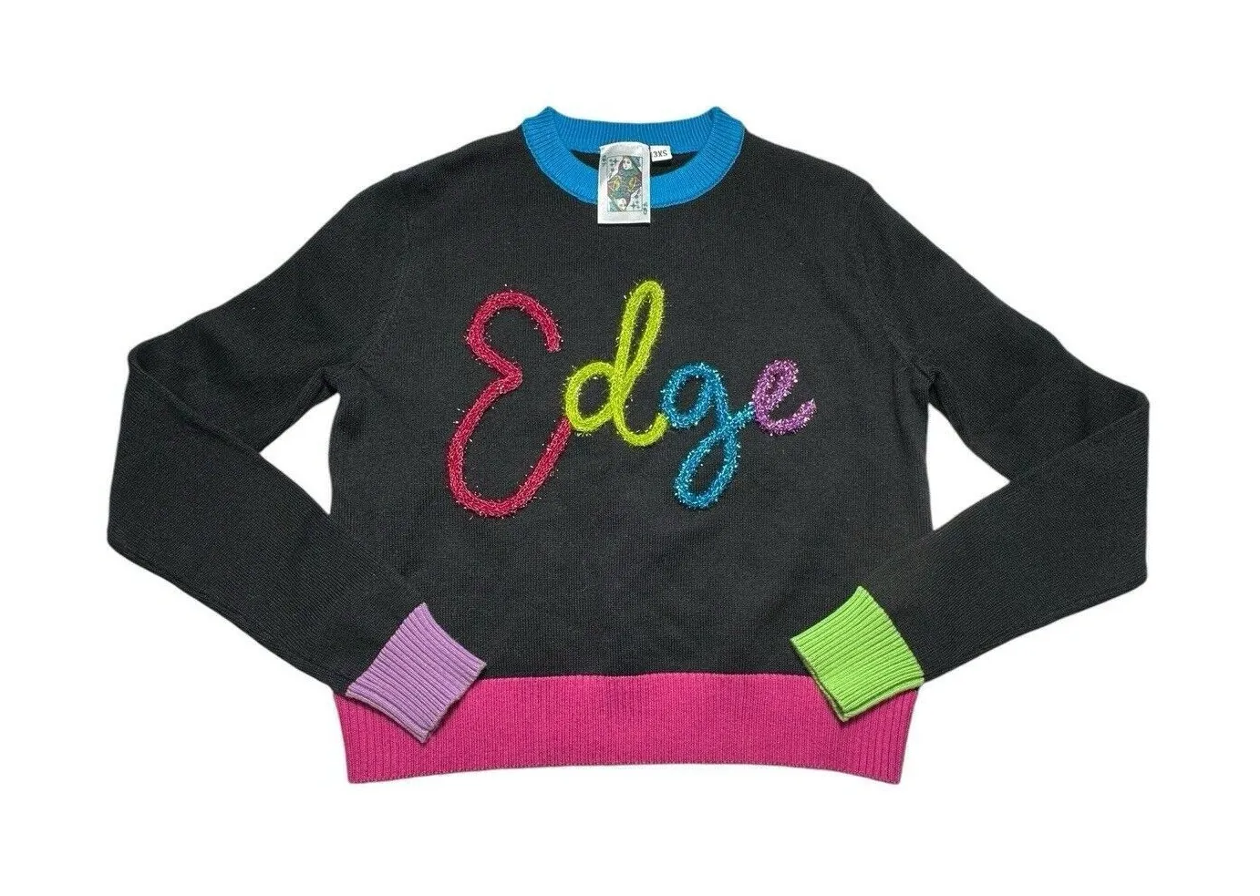 Add some sparkle to your wardrobe with this Queen Of Sparkles sweater. The Edge detail in rainbow black and multicolor sparkles accents adds a touch of designer flair to this cardigan. Made from a comfortable cotton blend knit fabric, this lightweight sweater features a crew neck and long sleeves with regular cuffs. The collarless design and solid pattern make it perfect for any occasion, from a day of colorful hipster style to a preppy college look. This sweater is available in women's size 3XS and is ideal for anyone who loves fashion and wants to add some fun to their wardrobe. Great preowned condition.