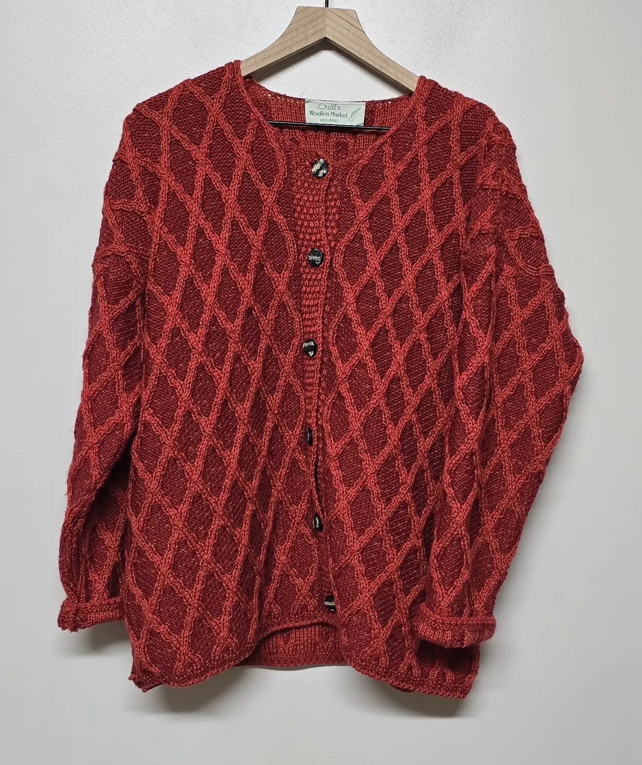 Wrap yourself in the cozy embrace of the Quill's Woollen Market Nordic Grandmacore Cardigan. This sweater showcases a vibrant red hue complemented by the classic Fair Isle knit pattern, evoking the timeless charm of an eclectic grandpa's wardrobe. Designed with a comfortable crew neck and long sleeves, it's the quintessential layering piece for those crisp days. Crafted from luxurious wool, this cardigan promises warmth and durability. It features a regular fit in a size large, ensuring a flattering silhouette for various body types. Accented with tasteful buttons, it adds a touch of sophistication to your ensemble, making it a versatile addition to any woman's clothing collection.