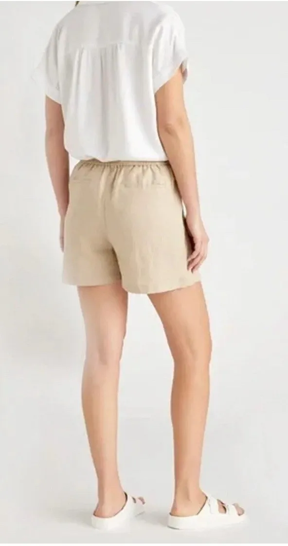 The Quince Women's Linen Shorts in size L are perfect for a beachy, coastal vibe. Made from 100% linen, these beige shorts are ethically woven and designed to be comfortable and stylish. The chino style adds a classic touch to these lightweight and breathable garments, making them a versatile addition to any woman's wardrobe. Ideal for warmer weather and relaxed outfits, these shorts are a must-have for those who appreciate quality craftsmanship and sustainable fashion. 22213. 4500