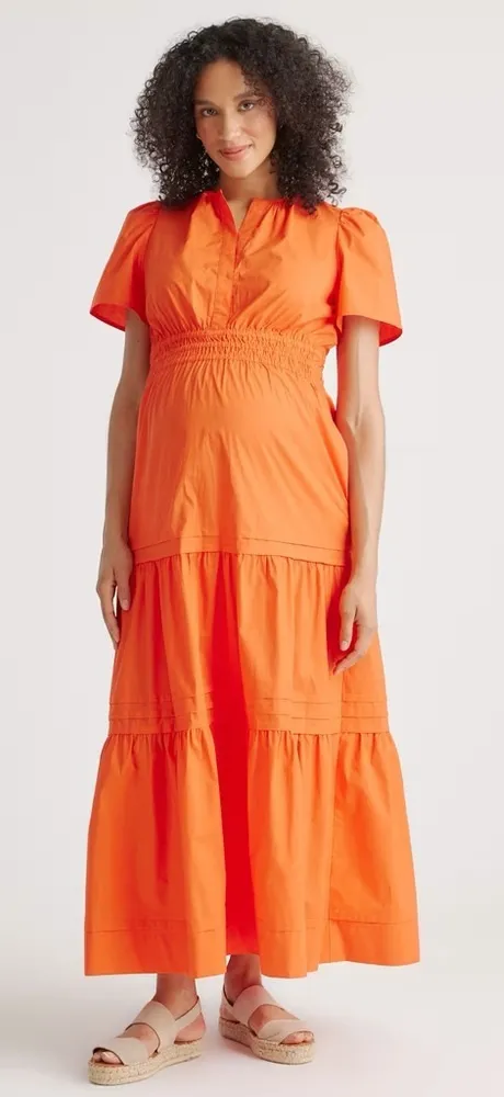 NWT Quince 100% Organic Cotton Poplin Maternity Tiered Maxi Dress in Vermilion Red Women’s Size XL BRAND NEW WITH TAGS The perfect maxi dress for all stages of pregnancy and beyond! Designed with a smocked waistband for a comfortable, yet flattering fit and functional side seam pockets for life's necessities. Made from 100% organic cotton for lightweight breathability. With a v-neck and short sleeves, this is a must-have for your summer wardrobe.