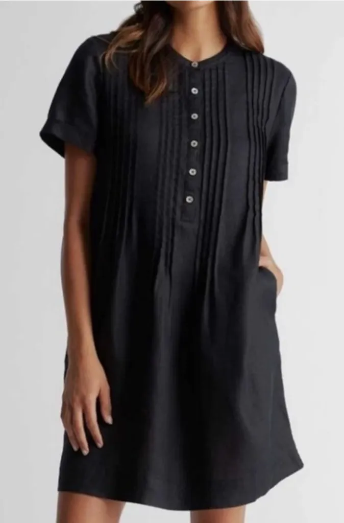 100% European linen Quince swing dress in black. Lightweight, breathable fabric with a relaxed, minimalist silhouette. Features a round neckline, short sleeves, button front placket, and vertical pleated detailing. Easy everyday dress for warm weather, travel, or casual wear. Condition: Good pre-owned condition. ⚠️ Note: small tear at one sleeve cuff (see close-up photo). Priced accordingly. Details Size: Small, fits very loose, see approximate measurements Length about 36” Armpit to armpit about 23” Hips about 25” Color: Black Fabric: 100% Linen Relaxed swing fit Short sleeves Button front Minimalist, Linen, Sustainable, Casual Chic, Summer Dress