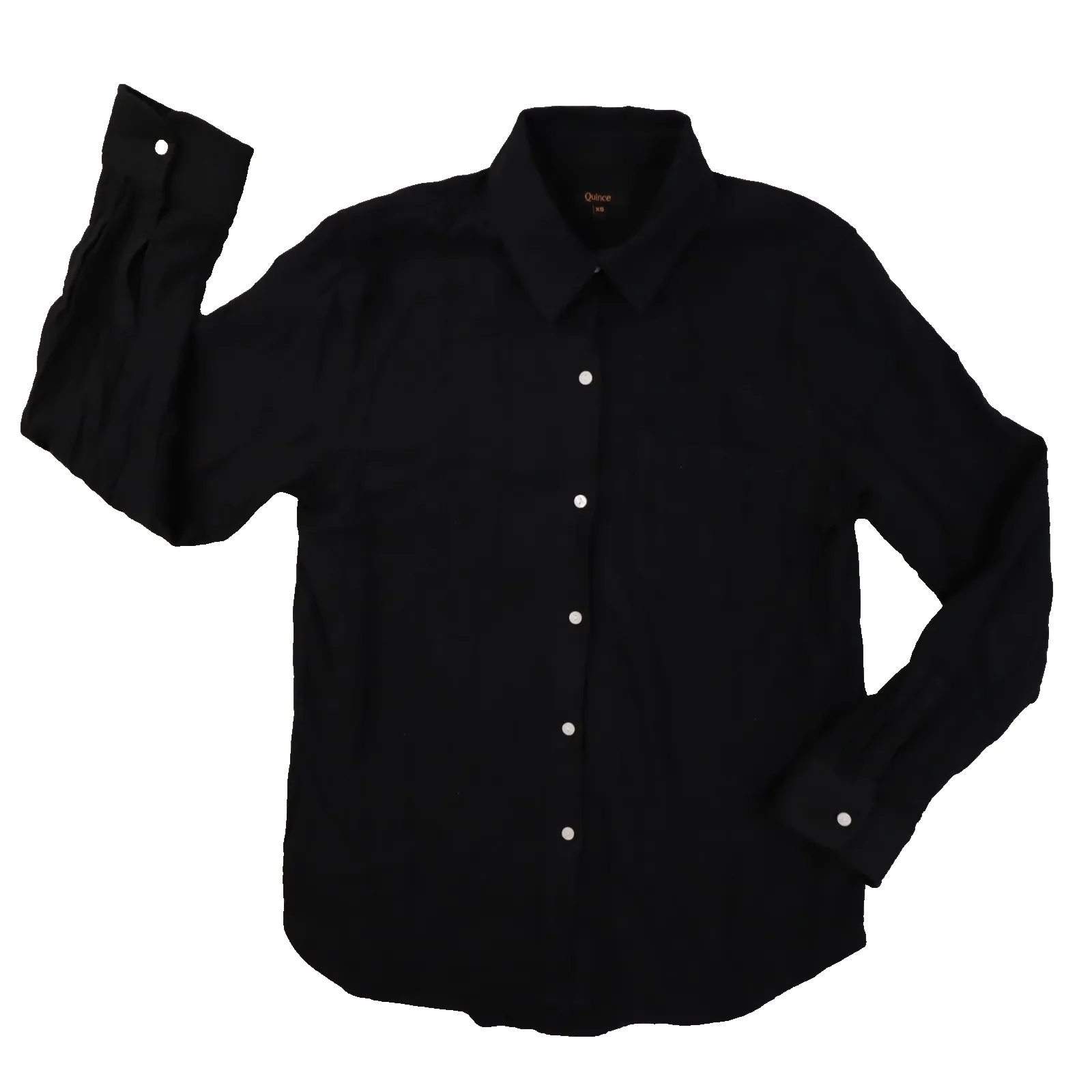 The Quince Gauze Button Up Shirt is a women's XS black long-sleeved top made of soft cotton gauze. It features a solid pattern, collared neckline, button closure, and a classic fit. The lightweight and breathable fabric makes it perfect for casual occasions during the summer, fall, and spring seasons. Easy to care for with machine washable instructions, this shirt is a versatile addition to any wardrobe. The brand, Quince, ensures quality and style in this basic yet stylish piece of clothing.