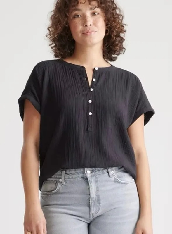 Quince 100% Organic Cotton Gauze Roll Sleeve Shirt Color: Black Size: Medium Preowned, no flaws With a relaxed fit, this short sleeve shirt is like your favorite broken-in tee, but elevated with a dolman sleeve, banded collar and a button-down three quarter placket. And made with our premium ultra-breathable organic cotton gauze, it feels like a dream. Armpit to armpit: 21” Length: 24”