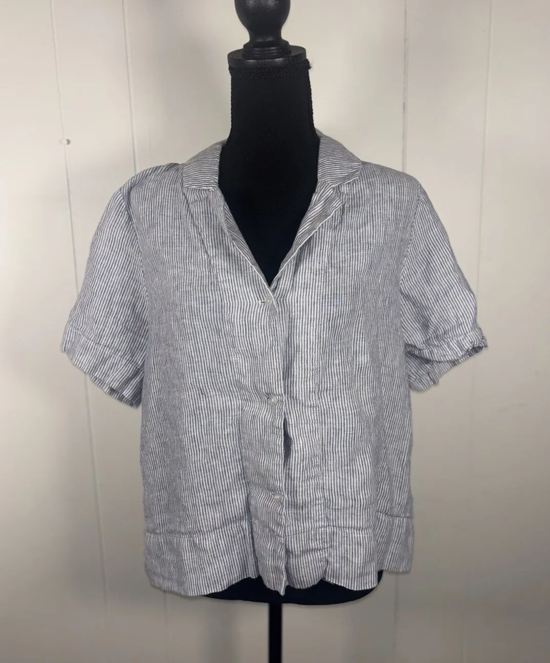 The Quince Women 100% European Linen Short Sleeve Shirt is a stylish and comfortable top perfect for any woman's wardrobe. Made from high-quality linen, this shirt is durable and breathable, making it ideal for wearing during warm weather. The blue pinstripe design adds a touch of elegance, while the short sleeves provide a casual and relaxed feel. In size L, this shirt is ideal for regular-sized women looking for a versatile and chic clothing option. 6562