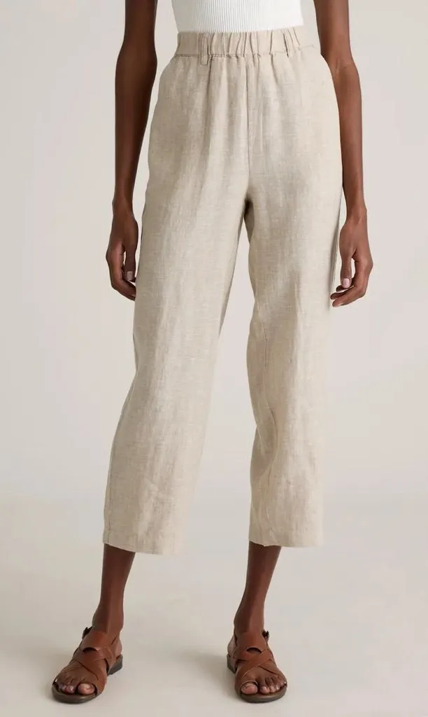 Brand new Quince women’s 100% European Linen Pants in the color flax in a Size Small. You're never going to look more chill than you will wearing these. They have a relaxed fit, three pockets, and elastic waist. Quince’s linen is made from 100% European flax, which is more sustainable and less resource-intensive to grow. Linen is the ultimate year-round fabric because it's breathable and naturally heat-regulating. • Made from ethically woven from 100% European flax linen • Rise measures 11” • Inseam measures 24 1/2” • Leg opening measures 16” • Waist measures 14” • Breathable, durable, hypoallergenic, lightweight • Elastic waistband • Two front pockets and one back pocket • This material is certified by OEKO-TEX Standard 100 which ensures that no hazardous substances are present