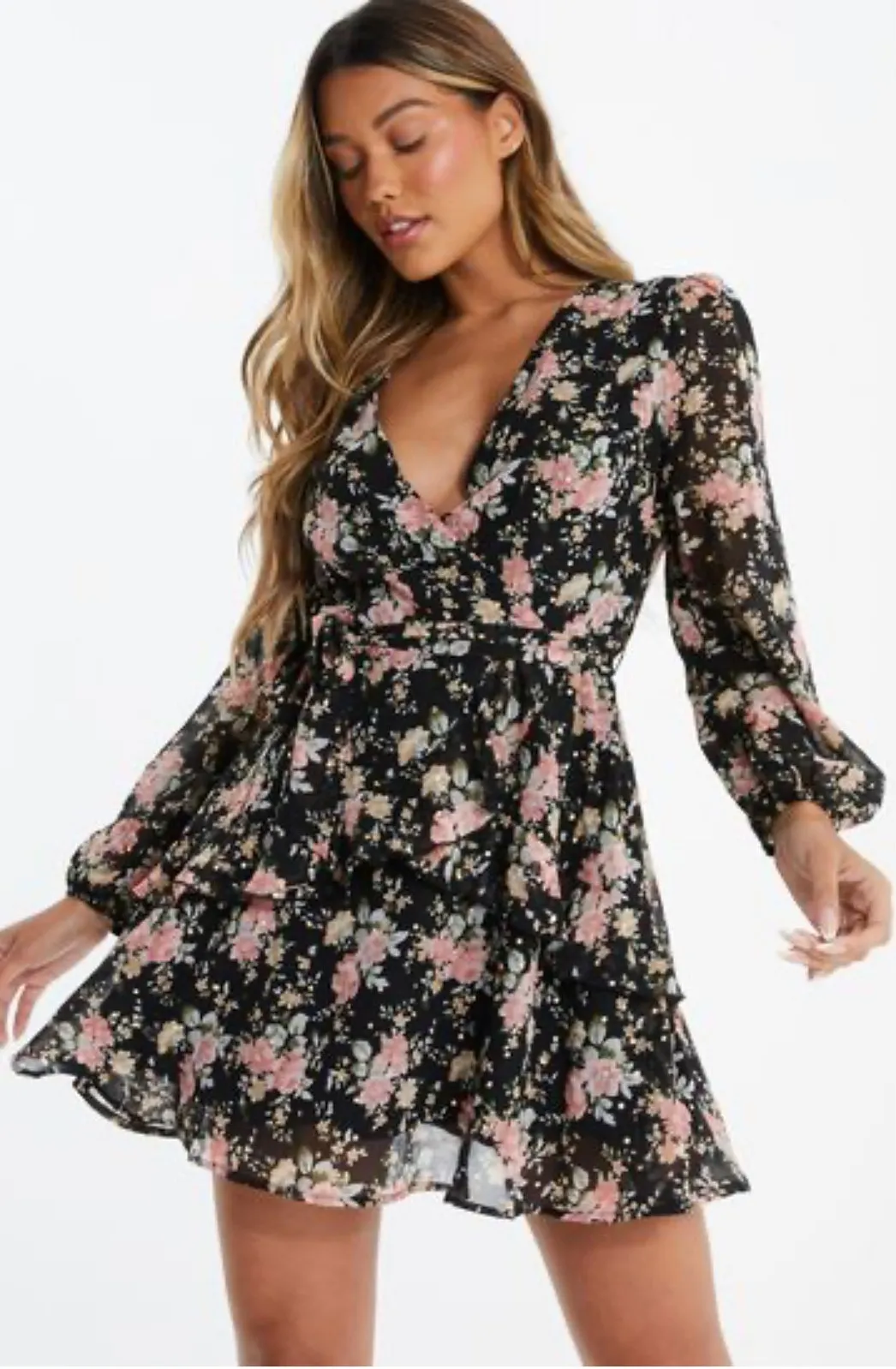 QUIZ size 6 Ruffle Mini Dress Black Floral Long Sleeve Tie Front Ruffle Hem New Black and pink floral print with gold metallic polk dots Long sheer sleeves V-neckline (implied by the wrap style) Tiered ruffled skater-style skirt Tie-front belt at the waist Measurements approximate laying flat 16.5" bust, 14" waist, 34" length, 22" sleeve Floral, Polka dot, Sheer, Romantic, Girly, Cottage, Eclectic, boho, Indie, Valentines, Date Night, coastal, beach, travel, tropical, Eclectic, bachelorette, club, night out, special occasion, holiday, derby, concert, minimalist, vacation, travel, cruise, girls trip, resort, chic, birthday, event, winery, wine tasting, honeymoon, retro, vintage, pretty, feminine, engagement, Euro Summer, Picnic, Mediterranean, Neutrals, Club ready, Scandi, Euro, Polished, Rodeo, Maximalism, Botanical, Garden, Timeless, Ranch sh2