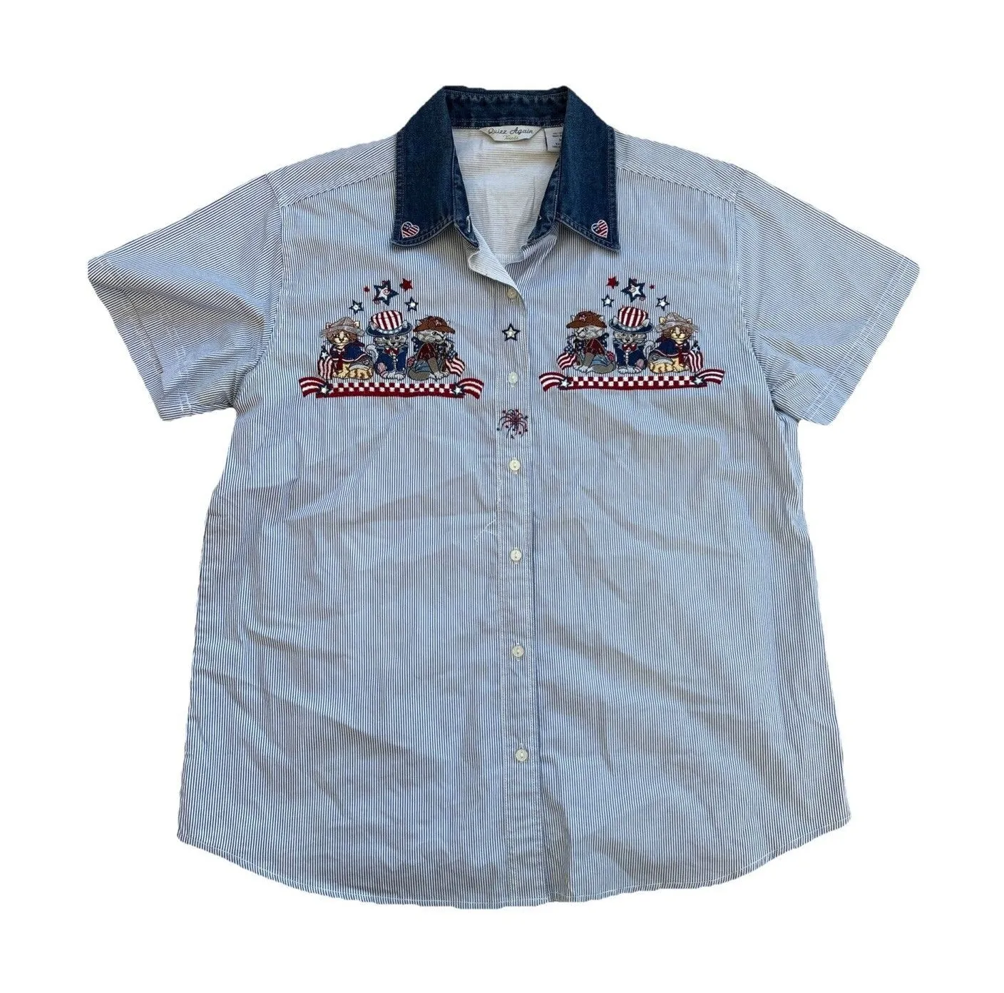 The Quizz Cotton Embroidered Cats Shirt is a women's Western country patriotic top, featuring a collared neckline, button closure, and short sleeves. Made from 100% cotton denim fabric with an animal print pattern, this vintage-inspired button-up shirt is perfect for various occasions such as travel, parties, casual outings, and workwear. With embroidered cat accents, this shirt offers a mix of western, patriotic, and colorful themes, making it a unique and stylish addition to any wardrobe. Machine washable and suitable for all seasons, this shirt is a versatile and comfortable choice for women looking to make a statement.