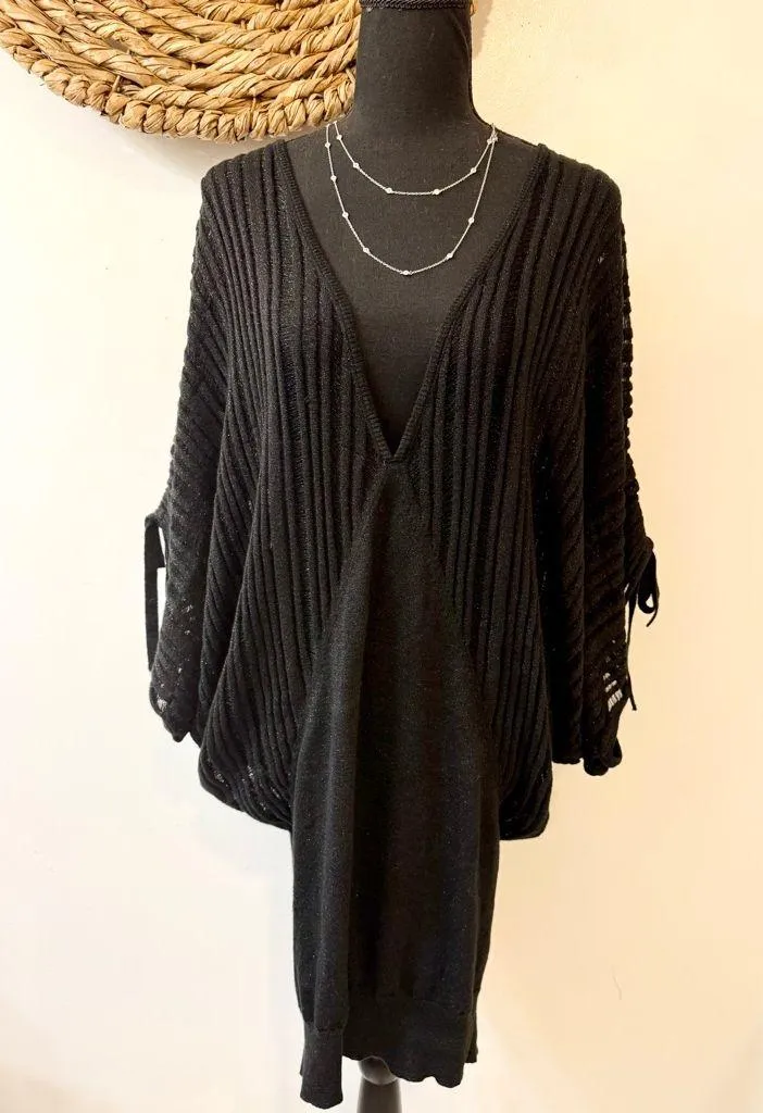 All Saints Zuri Black Metallic Mini Dress. Little black dress with an edge. This dress features a deep v-neck, adjustable bat wing sleeves and a form-fitting skirt. It is made with a delicate, sheer knit of black and metallic threads. It is lightweight and has some stretch. Dress it up or down, you’ll definitely stand out in the crowd in this one! Size small. Pit to pit - n/a, bat wing sleeves have no actual pit to measure from Length - 37” Excellent pre-owned condition with almost no signs of previous wear noted. No rips, stains or holes. Please see all photos as they are part of the description and ask for more information if needed.