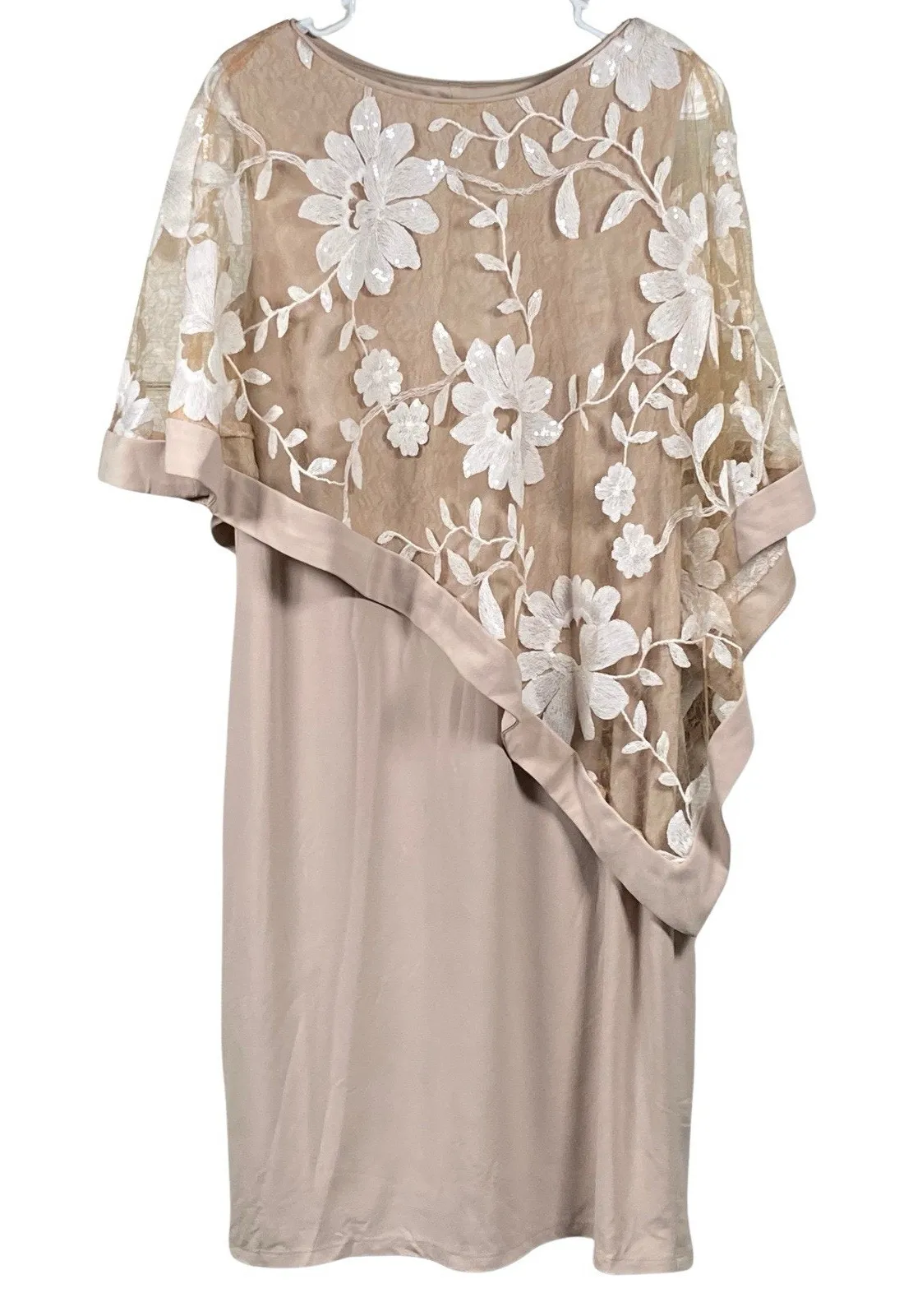 Elevate your wardrobe with this elegant R&M Collections champagne sheath dress in size 16, featuring a beautifully detailed champagne and ivory floral lace overlay. The sleeveless midi-length design offers timeless sophistication, while the asymmetrical lace overlay—shorter on the right, longer on the left—adds a modern, eye-catching touch. Crafted for comfort and a flattering fit: * Dress: 95/5 polyester/spandex * Lace: 100% nylon * Lining: 100% polyester Brand new with tags (NWT $100). Measurements: * PTP: 21" * Waist: 40" * Length: 40" A stunning choice for weddings, special events, or any occasion where you want to look effortlessly refined. Mother of the Bride