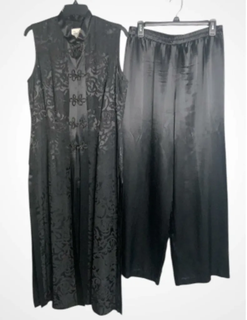 Chic black pantsuit with intricate patterns. Includes matching pants. Ideal for stylish occasions. A cheongsam, also known as a qipao, is a traditional Chinese dress that became popular in the 1920s and 1930s, characterized by its close-fitting style, standing collar, and high side slits. Excellent Condition R&M Richards Black Satin Sleeveless Cheongsam & Wide Leg Pants Size 14 Embroidered Elastic waist pants Acetate and rayon Dry clean Size 14 Approx measurements laying flat Top: 20” armpit to armpit 50” shoulder to hem Pant: 15-20” waist 15” rise 30” inseam
