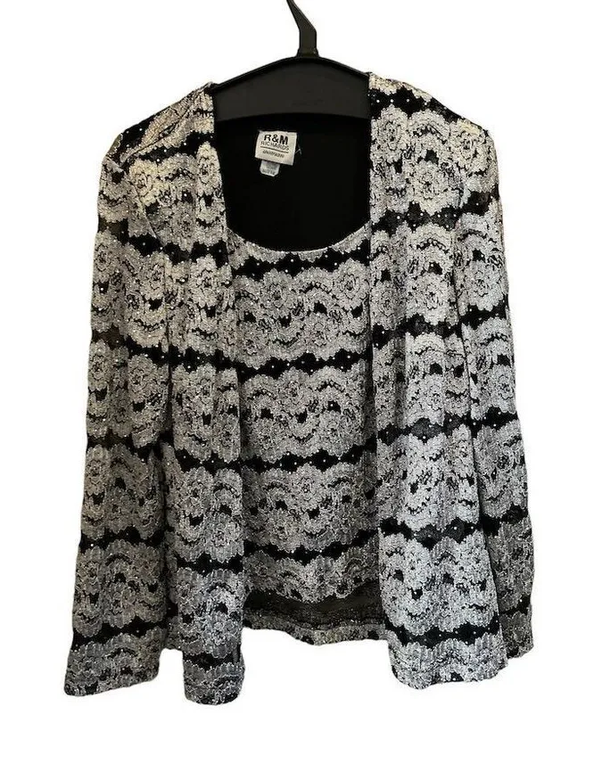 Elevate your evening wardrobe with this stunning R&M Richards 2-layer set in classic black. This elegant outfit includes a long sleeve open front lace jacket attached sleeveless camisole top adorned with sequins, perfect for adding a touch of sparkle to any special event. Whether you're attending a formal gathering, an evening gala, or a special celebration, this ensemble ensures you look effortlessly chic and sophisticated. Size 14, regular fit. Dry clean only. Pre-owned, in excellent condition. Keywords: R&M Richards, black outfit, women's formal wear, evening set, lace jacket, sequin top, special events, size 14, long sleeve, camisole, elegant attire, formal outfit, women's clothing, pre-owned, chic ensemble. Brand: R&M Richards Color: Black Department: Women Size: 16 Number of pieces: 1 Material: Lace, Sequins Occasion: Evening, Formal, Special Events Sleeve length: Long Sleeve Features: Open front jacket, Sleeveless camisole top Pattern: Lace Vintage: No Garment care: Dry Clean Only