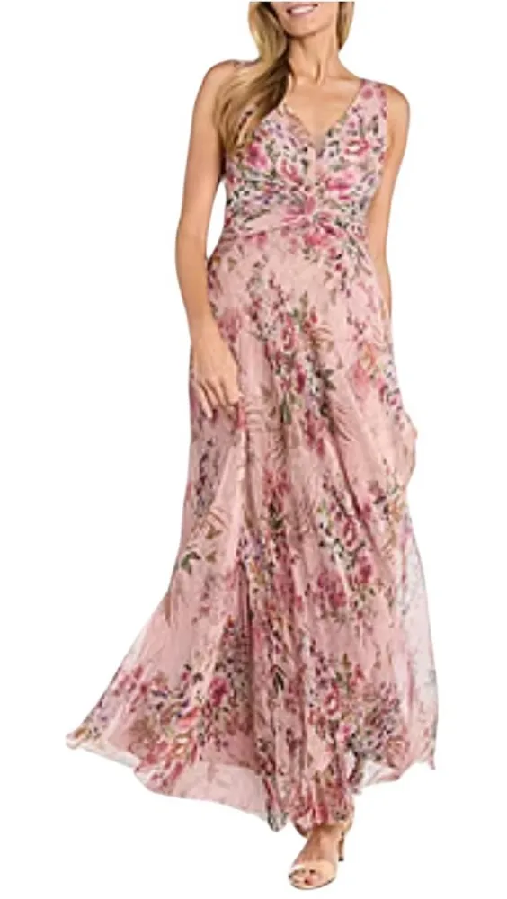 Floral sleeveless gown Made from a flowy crinkle material that's fully-lined, it has a V-like neckline, a ruched waist, and a concealed back zip closure. Each design effortlessly blend modern femininity with timeless elegance, making them ideal for special occasions. Pleated V Neck Sleeveless Zip closure in the back Coral peach color New with tags Size 6 Approximate measurements Chest 17” Waist 14” Length 62” -2
