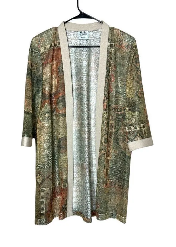 Vintage R&M Richards By Karen Kwong Green Multicolor Duster. Excellent condition. Crochet knit fabric. Very thin lightweight. Shoulder pads. Beautiful green brown colors. Leaf plant print perfect for fall. No size tag would fit a size small to a size large see measurements Tags: fall cardigan kimono vintage Duster boho Measurements Laying Flat Length: 33 inches Pit to pit: 22 inches Arm length: 17 inches