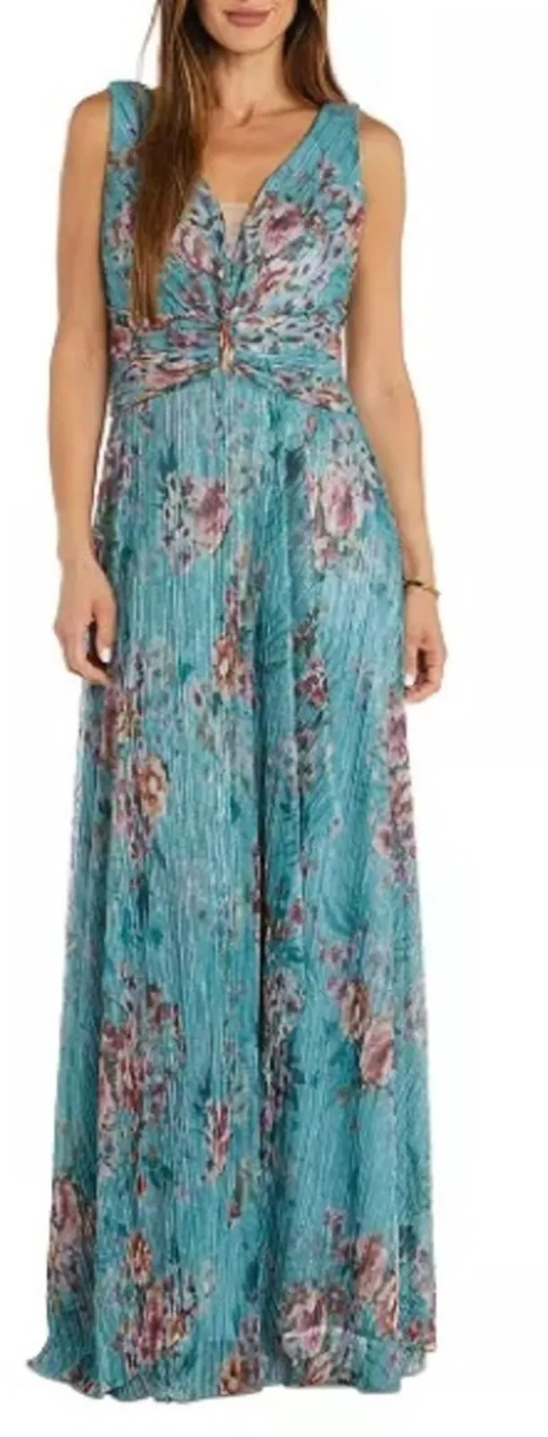 New with tags R & M Richards Metallic Floral Print Sleeveless Gown Color: Turquoise Blooming with painterly flowers and soft metallic touches, R & M Richards' sleeveless gown is finished with a waist-defining gather. Floor-length formal dress V-neck; Gown silhouette Back zipper closure Sleeveless Allover floral print metallic stripe; gathered at waist Lined Approx. 49-3/4" long from center back neck to hem Women's Size 12 Tags: Formal, Mother of the Bride, Wedding Party, Wedding Guest, Bridal, Cocktail, Special Event, Black Tie, Evening, Date Night, Night Out, Bachelorette Party, Mother of the Groom, Gala, Red Carpet, Military Ball, Prom, Homecoming, Princess, Pageant, Bridesmaid