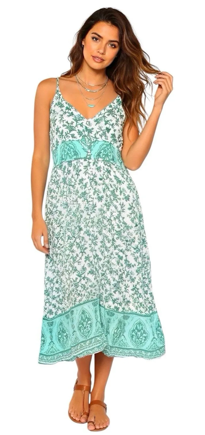 R. Vivimos Dress Sz Small Sz 4-6 Midi Smocked Sleeveless Floral Bohemian Boho Cottagecore Coastal Co... Show more