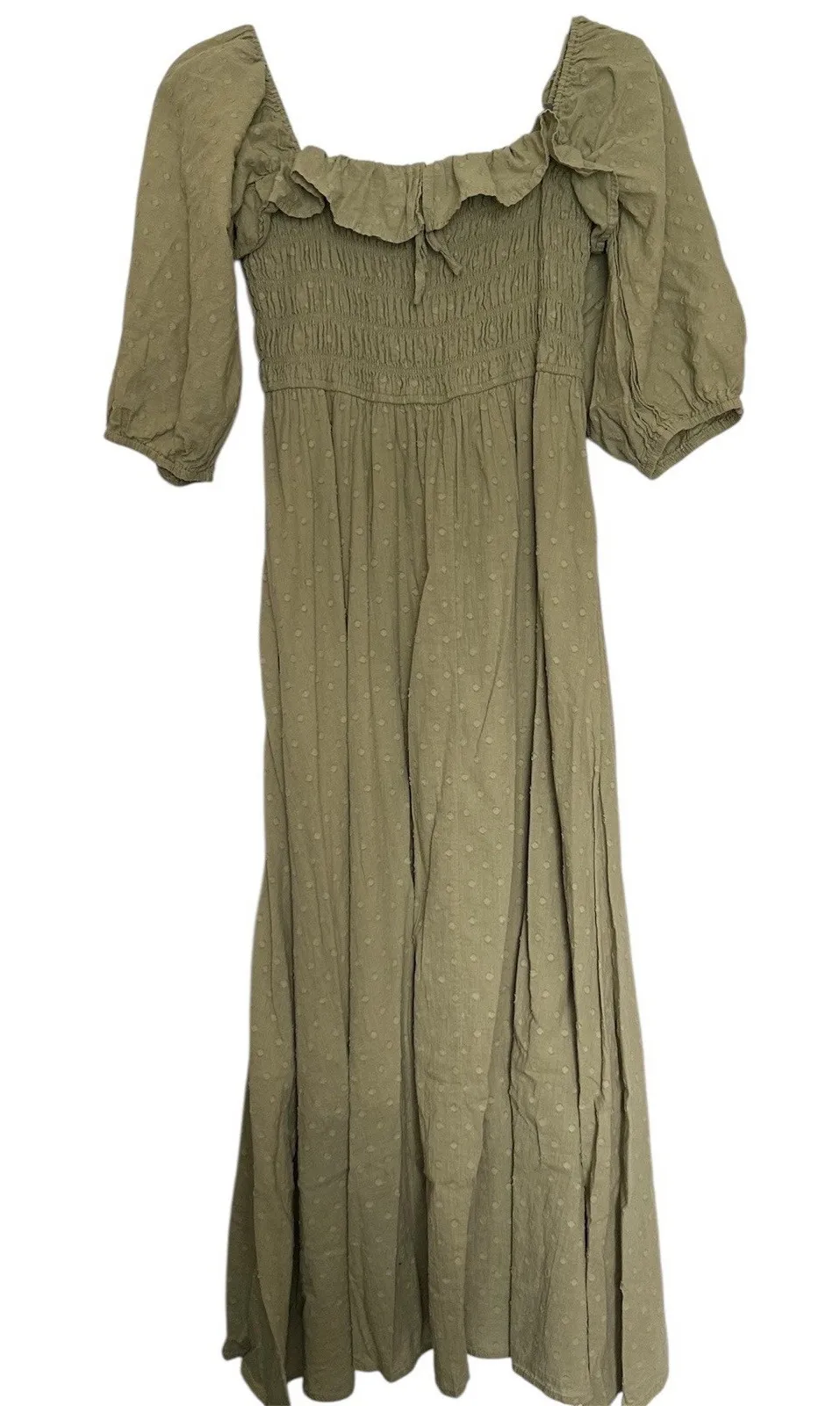 The R Vivimos Women's Midi Dress in size Large (12/14) is a beautiful sage green dress with a smocked top and off-shoulder neckline, perfect for various occasions including weddings, parties, or casual wear. This lined A-line dress features a polka dot pattern, puff sleeves, and is made from a blend of rayon and cotton. The pullover closure and machine washable fabric make it convenient and easy to care for. With a whimsical fairy character and grunge theme, this dress is a versatile and stylish choice for any season. Pit to pit 15" but fully elastic Length 42" Length