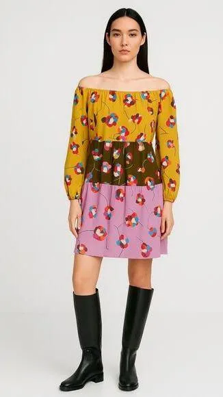 BCBGMAXAZRIA Multicolor Floral Colorblock Off the Shoulder Mini Dress Long Sleeve Tiered Stretch Pol... Show more