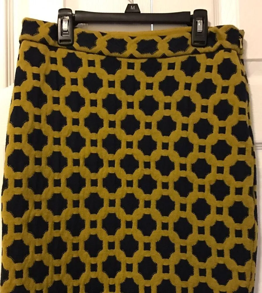 High waisted pencil skirt. Side zip. Textured geometric pattern. Sweater knit with some stretch.