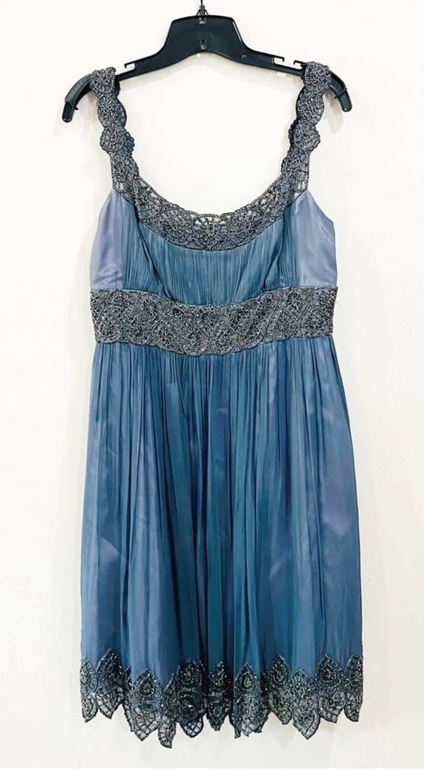 Elegant Adrianna Papell evening dress featuring stunning silver-grey beaded straps and an empire wai... Show more