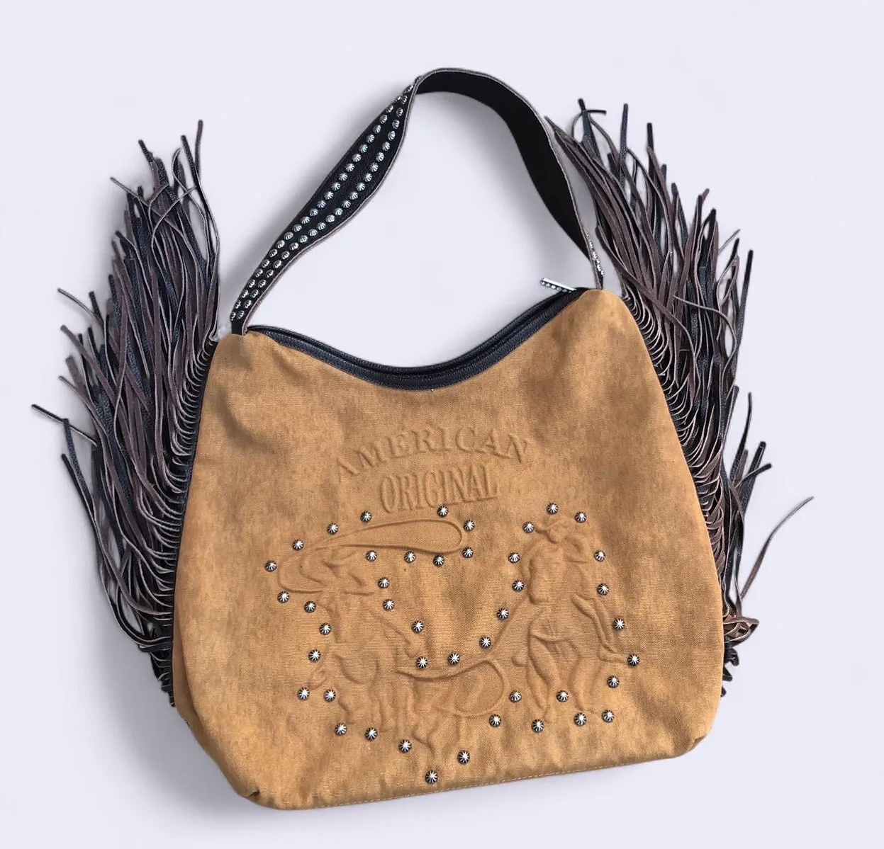 Raviani Brown Fringe Studded Bling Western Hobo Shoulder Bag Purse Cowgirl Leather Canvas American Original #Rodeo #Horse #Rancher #Farmer Measurement in pics Great condition - $339 - From Victoria