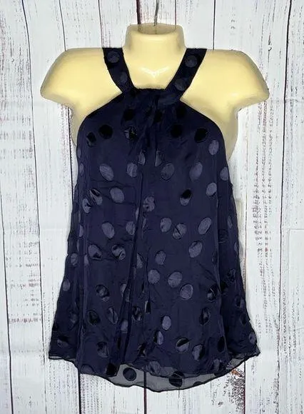 ECI New York Size 14 Navy Blue Swiss Dot Halter Tank Top. Keyhole with 3 Buttons (Back). Sleeveless. Fully Lined. Shell is Nylon, Rayon & Silk Blend - Lining is Polyester/Spandex Blend. NWT, Brand New with Tags. Length is 26.5” & Bust is 19.5”. Measurements taken while garment is laying flat.