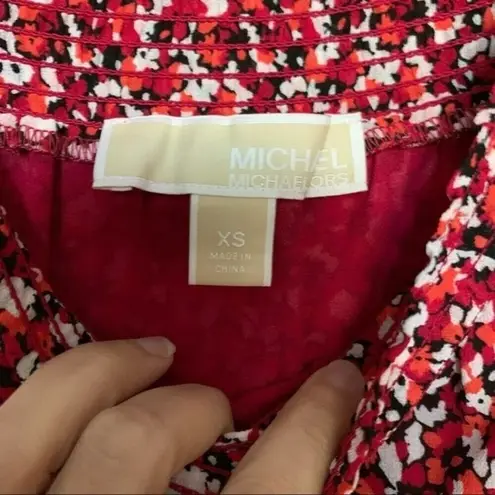Michael Michael Kors Sunari on/ off shoulder dress size extra small Long sleeves smocked elastic at neckline and waist line Cascade tiered or layered ruffle bottom Dotted speckle pattern and bright colors pinks corals etc. has elastic on sleeve ends in excellent condition worn only once Stock photos just to show fit. It is not blue it is reds and pinks