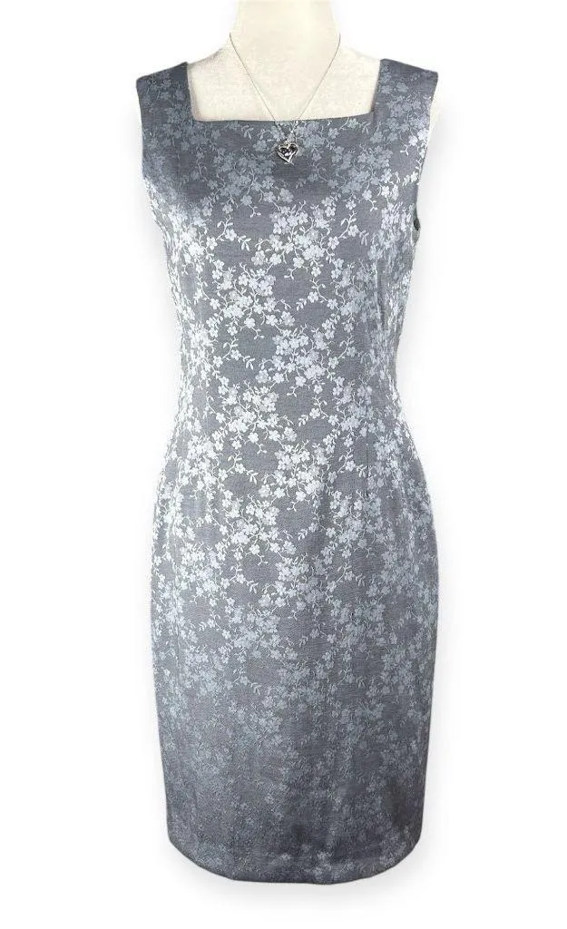 Beautiful vintage Kasper ASL sheath dress from the late 80s to early 90s, featuring a shimmering metallic blue-gray floral jacquard design. The sleeveless cut and square neckline create a timeless, tailored silhouette, perfect for formal occasions, cocktail parties, or elegant evening wear. Fully lined with a back zip closure. Minimal makeup stains on a few flowers (see photos), but overall in good vintage condition. Features: ✔ Metallic floral jacquard fabric ✔ Classic 80s/90s sheath silhouette ✔ Back zip closure, fully lined