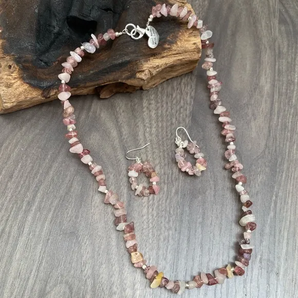 New - One of a Kind Handcrafted Artisan Strawberry Quartz Chipped Stone Beads and Silvertone Bead Necklace and Earrings Set. Necklace has lobster claw clasp, silver tone beads. Approx. 19” Earrings approx. 1 1/2” drop. Comes with complimentary jewelry pouch. Every handcrafted piece is unique and one of a kind. Bundle likes for greater discounts. Happy to consider your offer. Closet Clear Out Days are a great time to cash in on discounted shipping on your purchase! Due to lighting item’s color may vary slightly from pictures. Thanks for checking out my listing.
