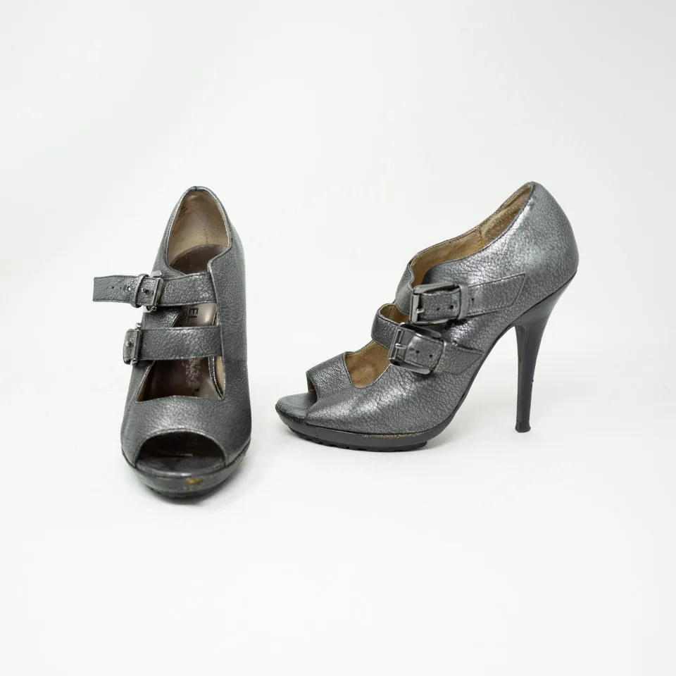 MICHAEL Michael Kors Genuine Leather Silver Metallic Buckle Peep Toe High Heels Gently pre loved co... Show more