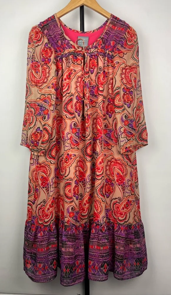 Rabbit Design Tan Purple Red Paisley Boho 3/4 Sleeve Babydoll Mini Dress Excellent used condition... Show more